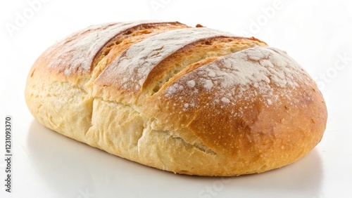 A freshly baked artisan loaf of bread, dusted with flour, showcasing a golden-brown crust and soft interior