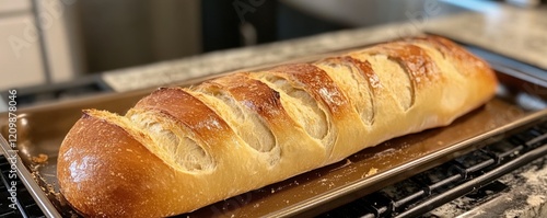 A freshly baked baguette, its crusty exterior giving way to a soft, chewy interior.