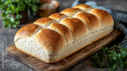 A freshly baked loaf of american white sandwich bread displayed on a cutting board with copy space for text and texture