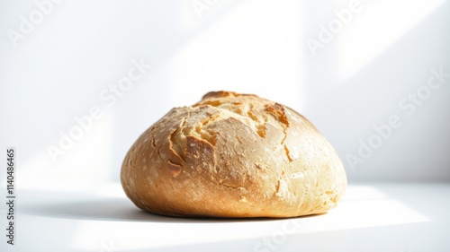 A freshly baked loaf of artisan bread sits on a white surface, bathed in sunlight.