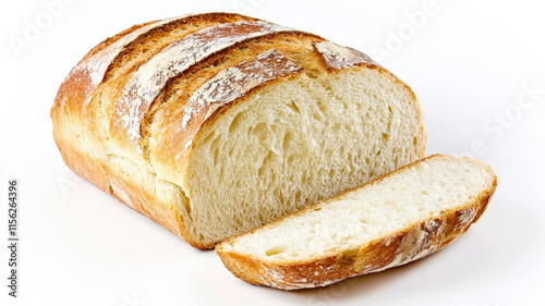 A freshly baked loaf of sourdough bread with a crispy golden crust, elegantly sliced to showcase its soft, airy interior, inviting a taste of homemade goodness.