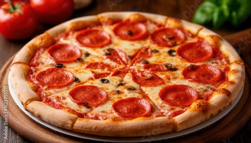A freshly baked pepperoni pizza on a wooden board. The pizza has a golden crust, melted cheese, and slices of pepperoni. Fresh tomatoes and green bell peppers are nearby.
