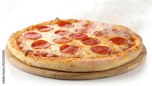 A freshly baked pepperoni pizza, steaming hot and delicious, sits on a rustic wooden board.