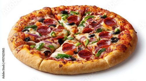 A freshly baked pizza with a crispy crust, melted cheese, pepperoni, and colorful vegetables, sliced and ready to eat.