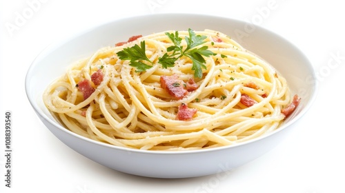 freshly, cooked, bowl, spaghetti, carbonara, creamy, sauce, crispy, each, vibrant, colours, subtile, captured, precision, set, isolated, white, background, highlight