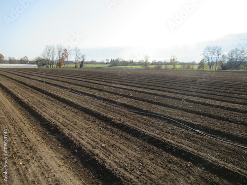 A freshly plowed field in an open rural landscape, with rich, dark soil neatly turned into furrows. This agricultural scene highlights the preparation for planting in a serene natural setting.