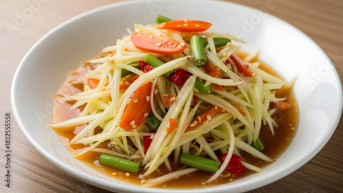 A freshly prepared and vibrant spicy green papaya salad, a classic and popular dish from Thai cuisine, served in a white bowl