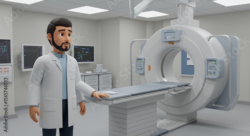A friendly doctor in a pristine medical facility stands near a modern medical imaging machine, ready for patient care.