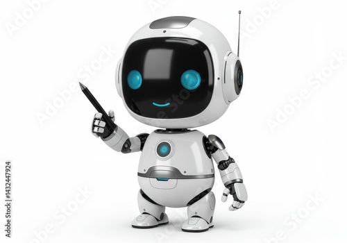 A friendly white robot with blue eyes holding a black pen on a white background in a studio shot