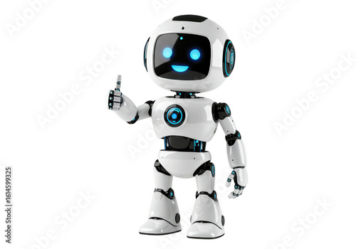 A friendly white robot with blue glowing eyes giving a thumbsup gesture isolated on transparent background