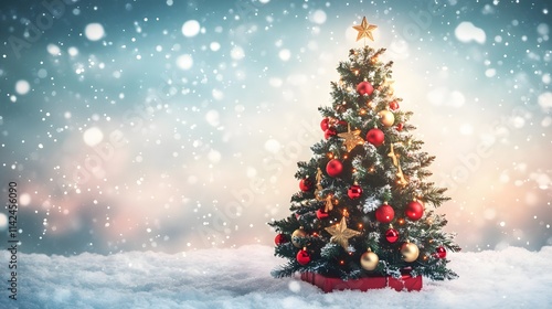 front, view, christmas, tree, glowing, red, gold, decoration, standing, sparkling, snow, bright, clear, sky