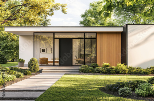 A front view of the exterior of a modernist house with white walls, black windows, and wood details on one wall