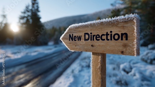 A frosty wooden signpost directing towards 'New Direction' against a serene winter landscape.
