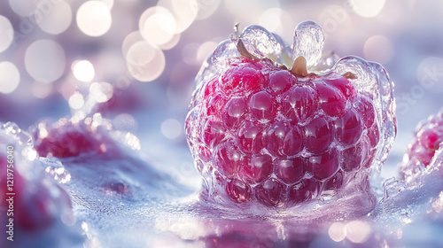 A frozen berry encased in glistening ice, glowing under soft light with intricate textures and vibrant colors, surrounded by a frosty pastel background, symbolizing winter and seasonal elegance