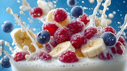 A fruit splash with bananas and raspberries on top of a white plate. The fruit is surrounded by milk droplets fresh mixed berries a banana, and milk. Concept of freshness and vitality. Blue backdrop