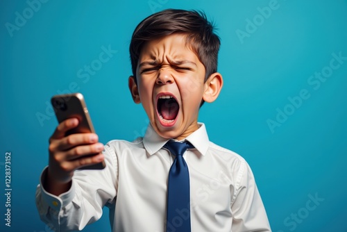A Frustrated Young Boy in Formal Attire Yelling at His Smartphone Against a Vibrant Blue Background, Capturing the Essence of Modern Youth's Struggles with Technology and Communication
