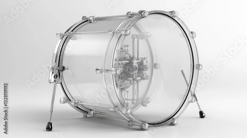 A fully assembled drum set with a transparent bass drum head, showing internal mechanics.