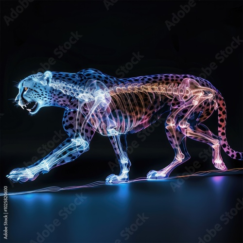 A fully transparent digital skeleton cheetah with glowing fur running. Transparent digital cheetahs, dynamic photos showing full-body bones, transparent cheetahs.