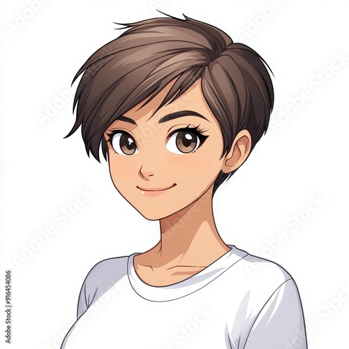 A fun cartoon of a mature girl with short hair, bright eyes, and a cheerful smile. Perfect for showcasing creative art