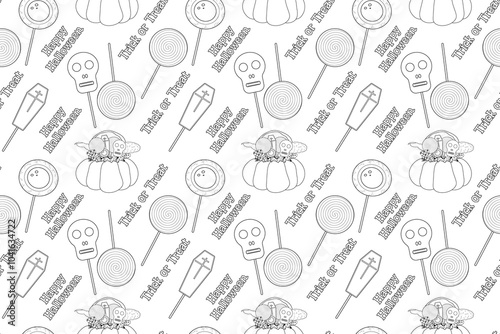 A fun Halloween-themed coloring page with a seamless pattern of candy, lollipops, and spooky treats. Perfect for kids creative activities.
