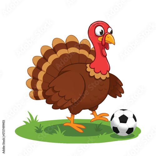 turkey, soccer, football, dribbling, ball, field, greenfield, white background, playful, funny, bird, avian, game, sport, action, vibrant, colourful, cartoon, character, animal, fowl, player, movement, athletic, competitive, simple, simplified, flat, vector, illustration, graphic, isolated, fun, joy, humor, activity, entertainment, skill, agility, whimsical, cheerful
