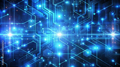 A futuristic abstract background with glowing blue circuits, fragmented code, and subtle grid patterns, conveying a sense of advanced technology and digital security.
