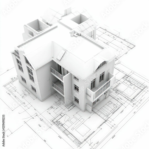 A futuristic architectural design fuses 3D modeling with technical blueprints, showcasing an elevated living space with integrated modern planning.