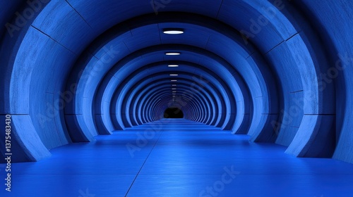 A futuristic blue tunnel stretches into the distance, its smooth concrete walls curving elegantly inward, creating a mesmerizing perspective of endless depth and architectural