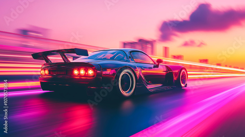 A futuristic car speeding at high velocity through a vibrant, blurred landscape at sunset