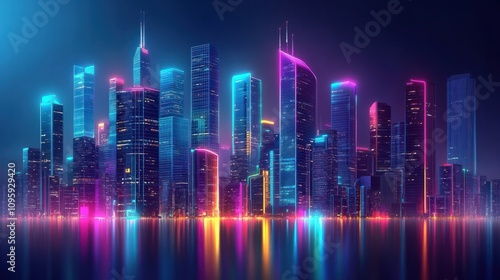 a futuristic cityscape at night, illuminated skyscrapers with neon lights