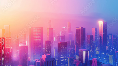 building, multitude, colours, pink, blue, purple, light, vibrant, city landscape, night, tall, height, design, myriad, shade, striking, scene, city, bright, soft, glow, sense, depth, sky, blend, hue, hazy, smoky, effect, overall, atmosphere, tall building