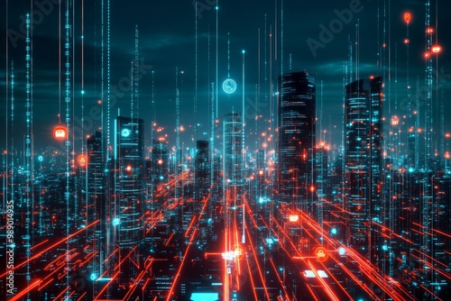 A futuristic cityscape illuminated by red and blue digital lines, representing a world of interconnected technology.