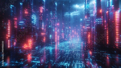 A futuristic cityscape illuminated by vibrant neon lights and digital elements.