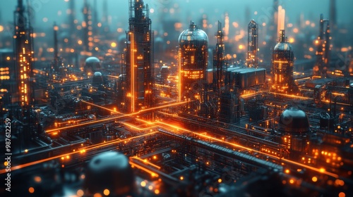 futuristic, city landscape, glowing, pipe, tower, orange, light, digital, render, abstract, industrial, technology, science, fiction, fantasy, architecture, design, art, structure, network, connection, complexity, system, steel, metal, grid, pattern, line, shape, contrast, dark, bright, dynamic, aesthetic, urban, modern, graphic, visual, style