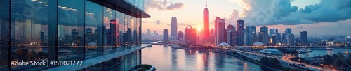 A futuristic cityscape skyline reflecting in a sleek, glass-walled building, symbolizing innovative ideas and forward-thinking corporate holdings , modern, global