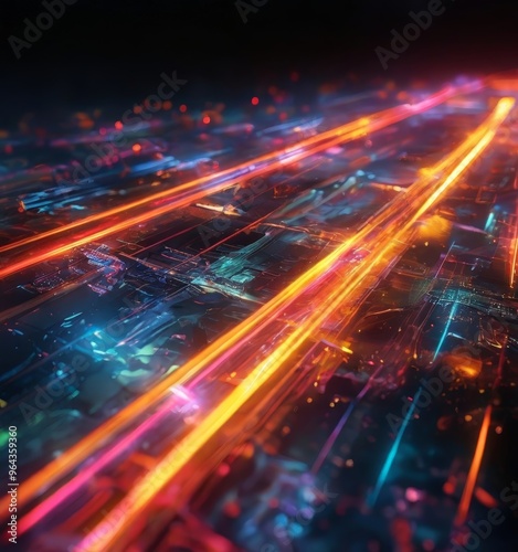 a futuristic cityscape with a complex network of glowing lines and lights, creating a sense of depth and movement.