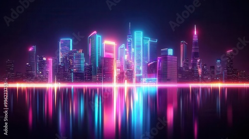 A futuristic cityscape with sleek, curved skyscrapers powered by wind and solar energy, glowing neon lights, energy-efficient and sustainable