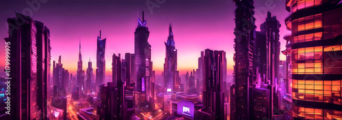 city landscape, panorama, futuristic, skyline, skyscraper, neon, sunset, urban, modern, night, science fiction, architecture, metropolis, light, tower block, glowing, technology, future, city, vibrant, atmosphere, digital, cyber, horizon, megacity, downtown, diversity