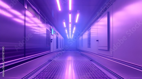 A futuristic corridor illuminated by vibrant purple lights, showcasing sleek walls and an ethereal ambiance