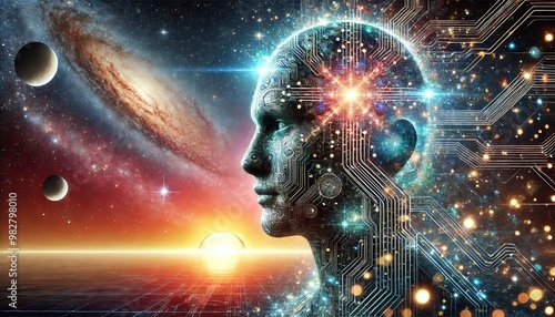 A futuristic, cosmic scene featuring a large humanoid head made of intricate circuits and galaxies, blending elements of technology and the universe