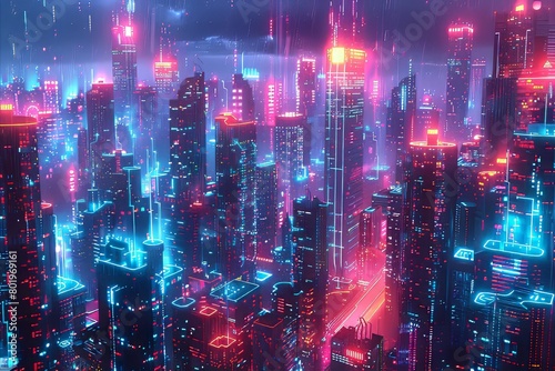A futuristic cyberpunk cityscape, illuminated by vibrant neon lights under a digital rain, showcasing advanced urban technology