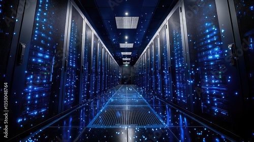 A futuristic data center with glowing blue server racks and digital particles, representing cloud computing, cybersecurity, and big data. Ideal for IT, networking, and technology themes