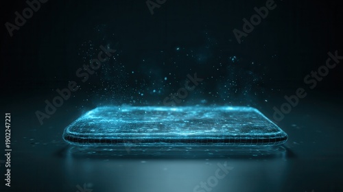 A futuristic digital device wireframe glows with bright blue light and floating particles on a dark reflective surface, representing advanced technology, innovation, and data connectivity.