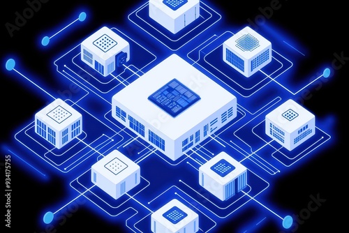 A futuristic digital graphic showcasing interconnected microchips with glowing blue lines representing technology and data flow.
