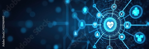 A futuristic digital network visualization depicting health related icons interconnected, symbolizing technology's role in healthcare and well being.