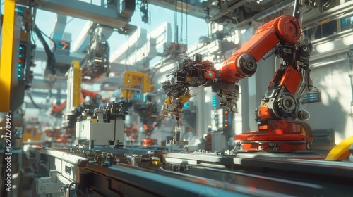 A futuristic factory scene with robotic arms assembling parts on a production line, perfect for modern industrial branding