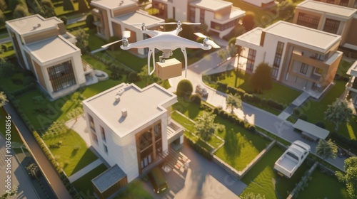 A futuristic flying drone delivering packages to suburban homes, residential setting with green lawns and modern architecture, Futuristic style