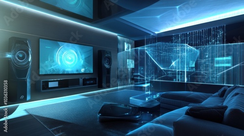 futuristic, home, entertainment, room, projection, system, sound, adjusting, content, modern, media, life events, theme, stylish, style, photo, illustrating, how, technology, interactive, adaptive, feature, high, quality, image, dynamic, high technology, setup