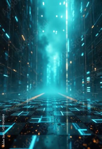 A futuristic, illuminated pathway amidst tall digital panels, evoking a sense of advanced technology and innovation. Perfect for tech, sci-fi, or virtual reality projects.