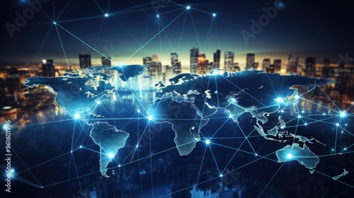 A futuristic illustration of the world map with glowing lines connecting different continents, representing global connectivity and communication.